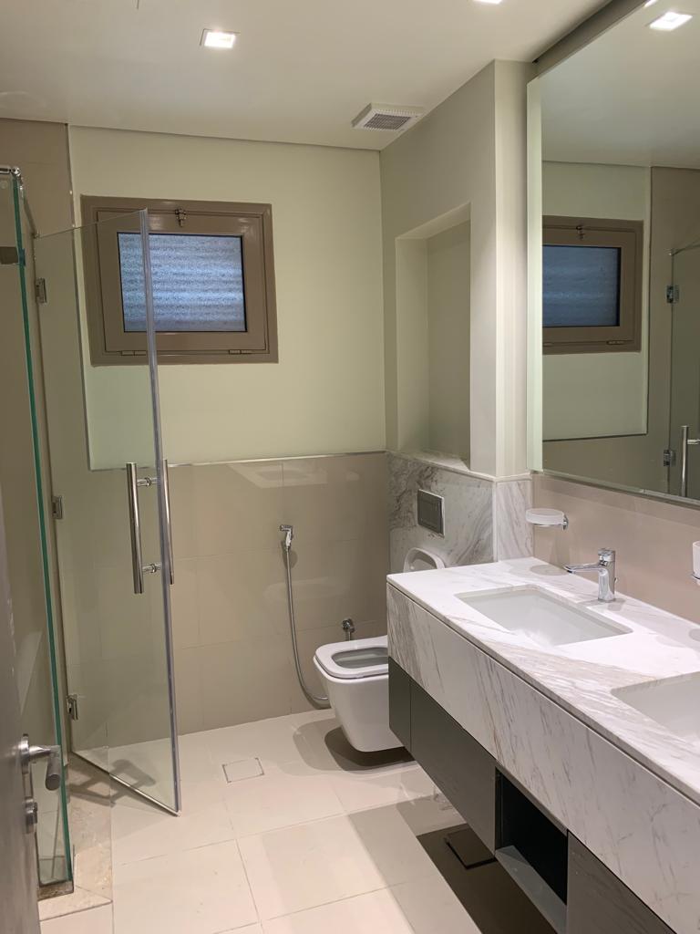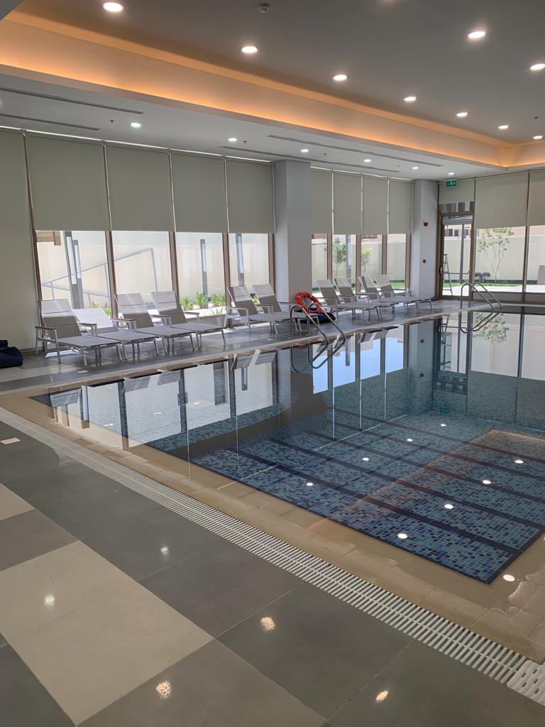The compound offers integrated amenities including fitness centers for men and women, swimming pools, recreational areas, a mosque, 24/7 security, and green spaces.